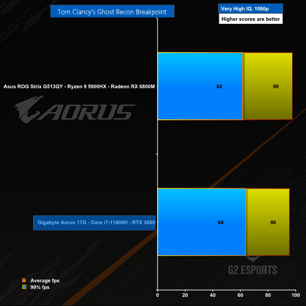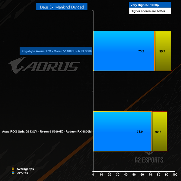 The Gigabyte Aorus 17G has a brand new eight core Tiger Lake CPU driving RTX 3080 16GB graphics to a Full HD panel so there was never any question of whether it could play games. Yes it can and it does it very well. The surprise comes when you see how this laptop compares to the Asus ROG Strix G513 Advantage Edition with AMD Ryzen 9 5900HK CPU and Radeon RX 6800M graphics as the Gigabyte puts up a stiff fight. We were looking for signs of the Core i7-11800H letting the side down but in fact both the CPU and GPU do a fine job for gamers.