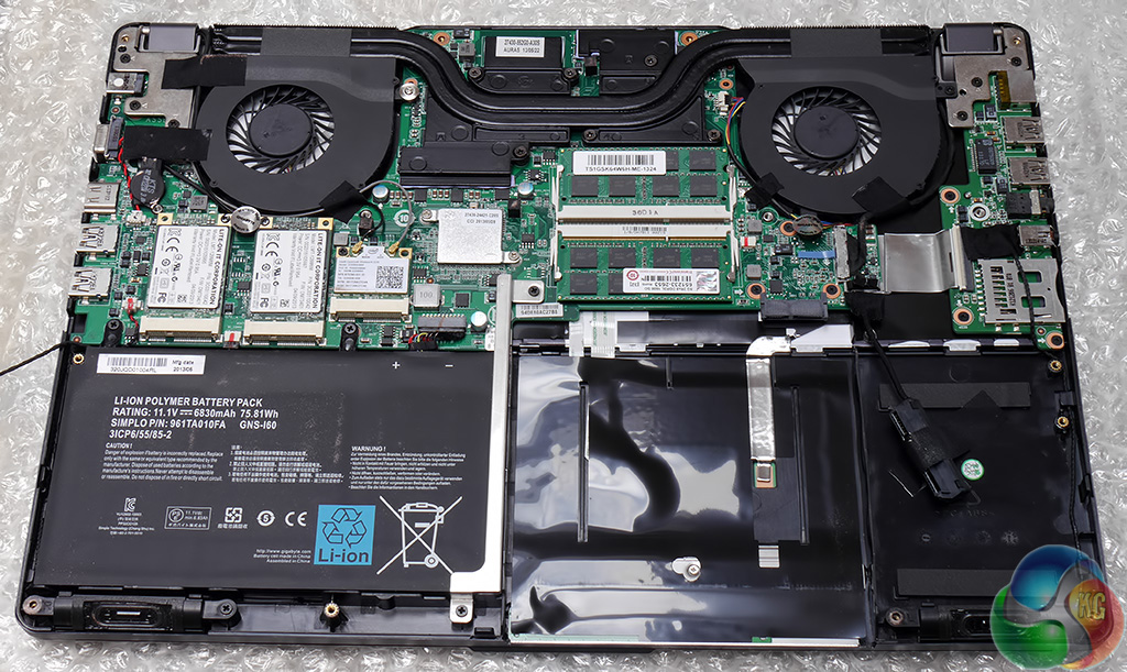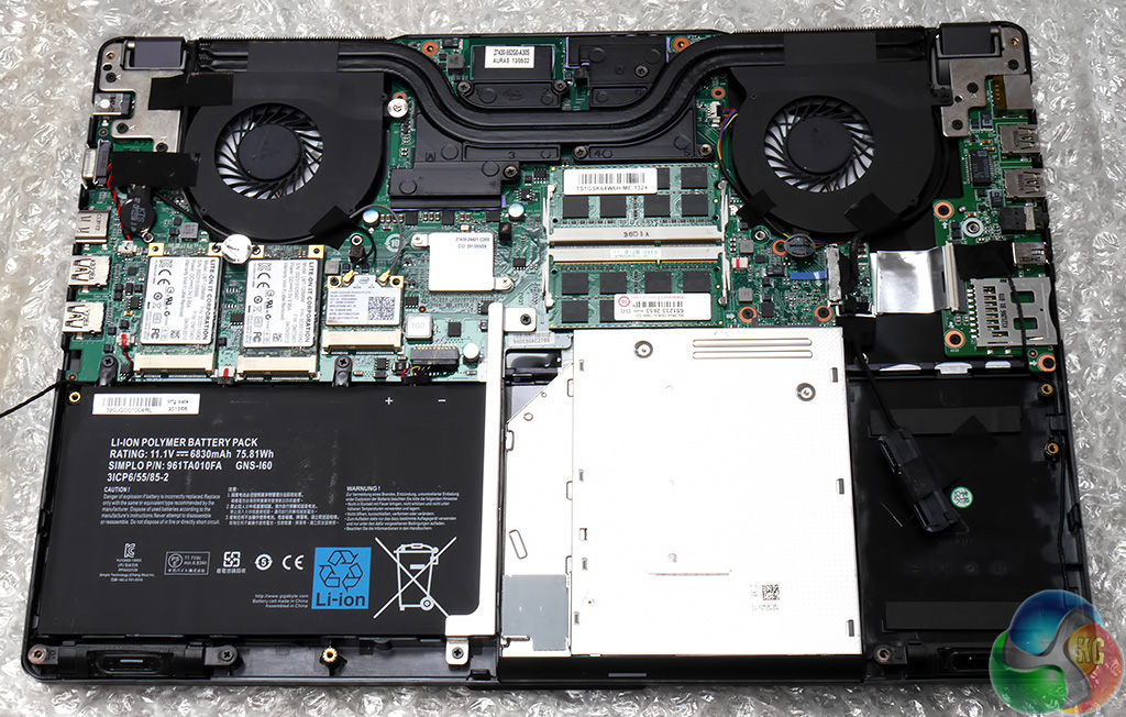 Remove ten more screws and the bottom of the chassis pops open to reveal the innards of the P35K. You'll note the laptop is upside down in the photo so the battery actually lives on the right hand side and the storage drive goes on the left.