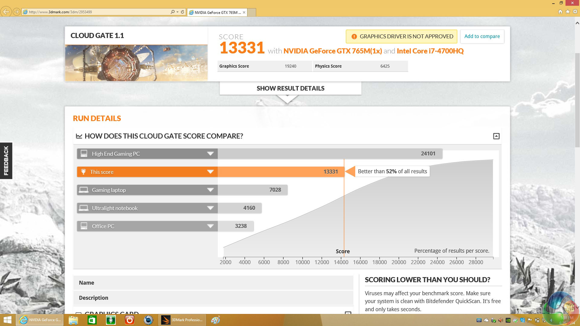 3D MARK showed the Gigabyte had slightly higher performance than the DinoPC Pegasus. This is what I expected to see as both laptops use the same Nvidia GTX 765M yet the Gigabyte has more recent drivers and a core i7 CPU rather than Core i5 which helps the Physics score along.