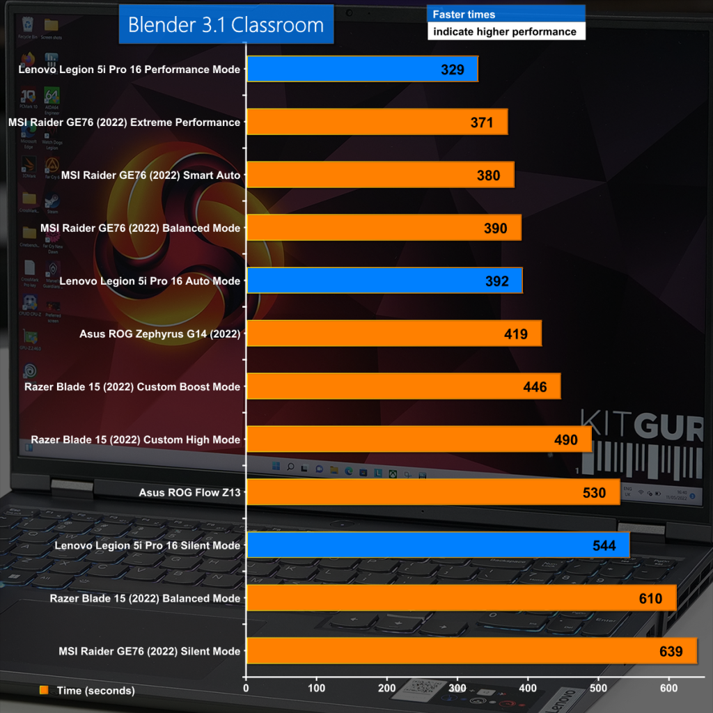 In our Cinebench R23 Multi Core we are comparing the Lenovo Legion 5i Pro 16 with the MSI GE76 Raider and Razer Blade 15 that we recently reviewed. On paper those laptops have superior CPUs to the Lenovo however our test results tell a different tale. Depending on the power mode you select the Lenovo can either perform OK, very nicely or absolutely amazingly.