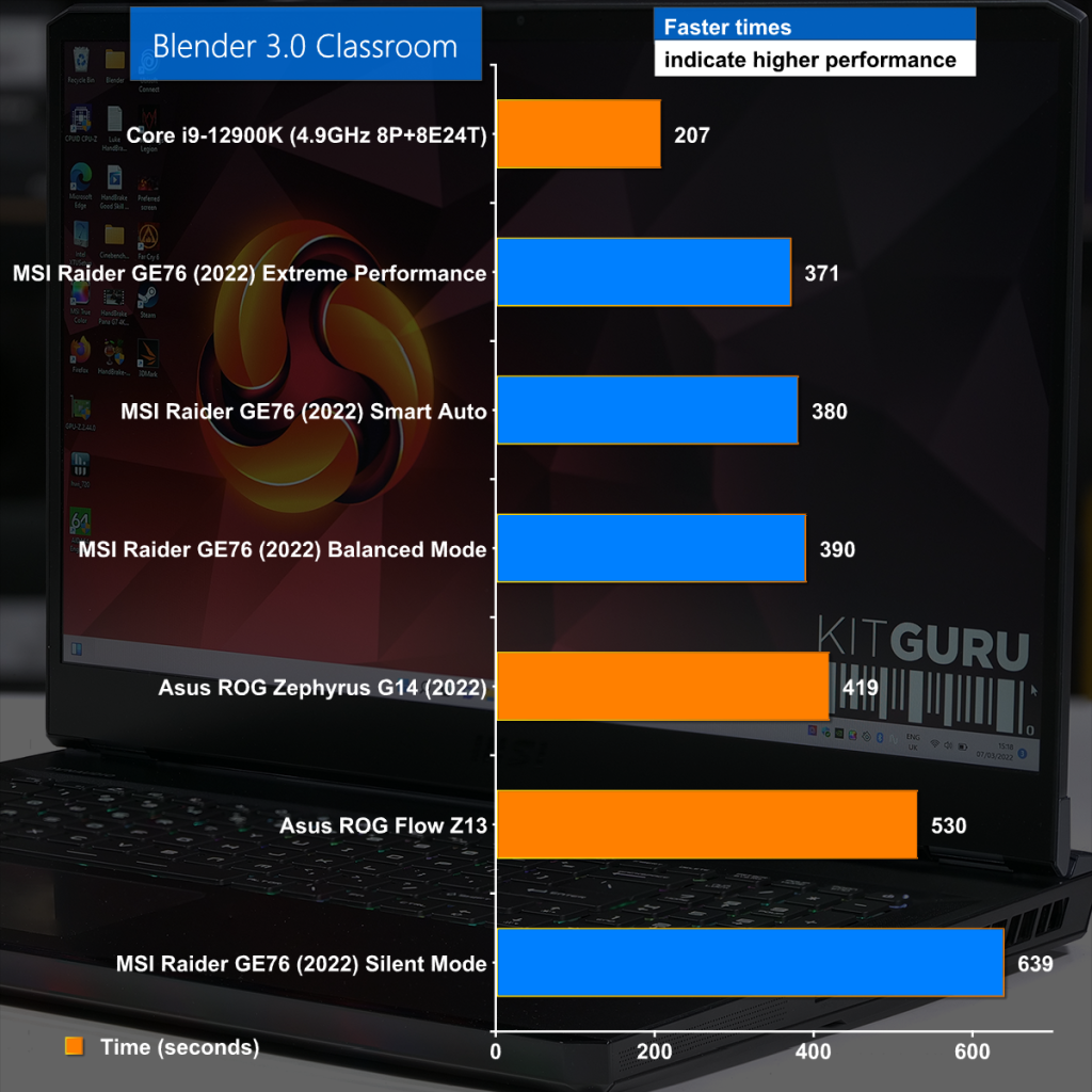 Version 3.0 is a new update to Blender that runs much faster than previous versions. We can see the laptop Core i9-12900HK delivers half the performance of a desktop Core i9-12900K however it stomps on other laptops in a comprehensive manner.