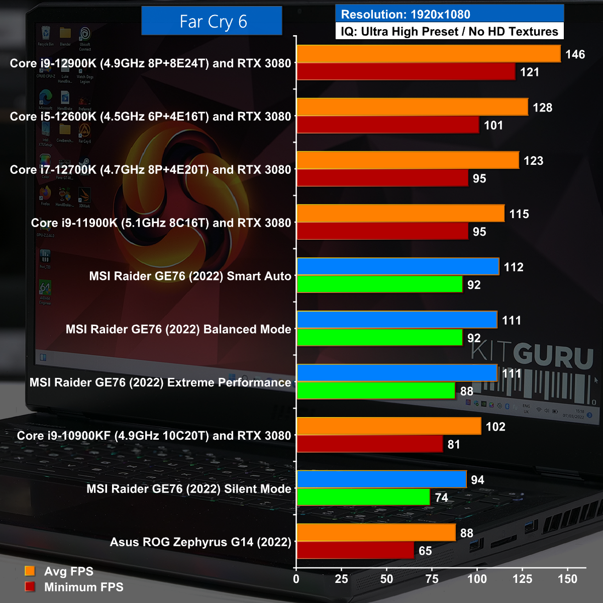 The new Raider GE76 delivers a superb gaming experience Far Cry 6 at 1080p however it is clear the laptop is limited by power constraints.