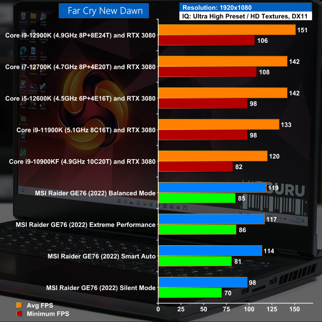 In Far Cry New Dawn the Raider GE76 does a good job once again and it is interesting to note it even performs well in Silent Mode where the CPU is operating on a mere 30W.