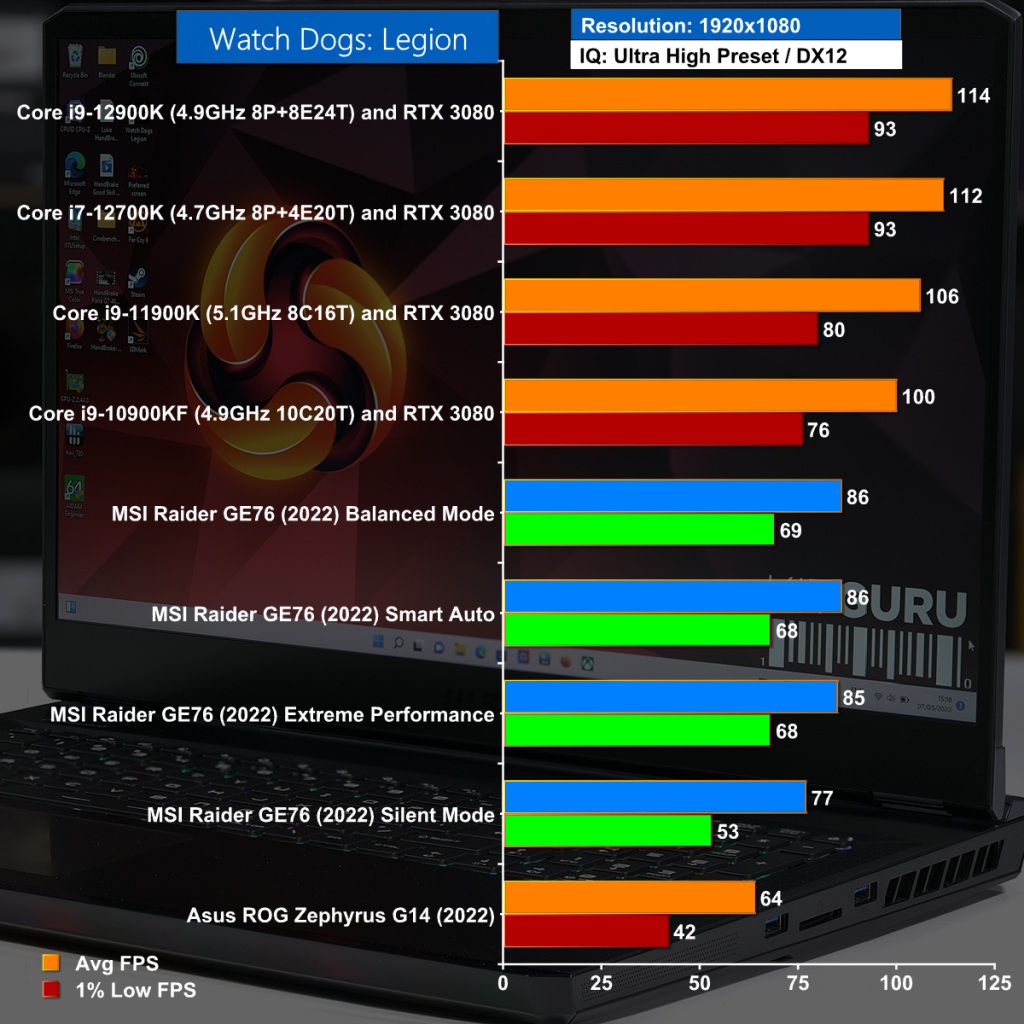 Watch Dogs: Legion runs well on the new Raider GE76 although once again it is clear the hardware is held back by the available power, and that is despite the large chassis and substantial cooling system.