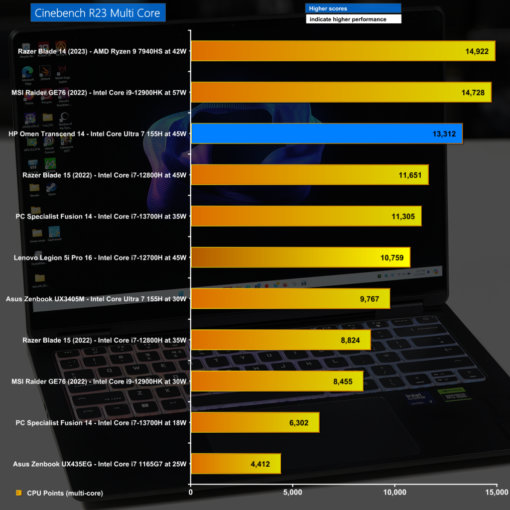 The HP Omen is off to a good start in Cinebench R23 Multi Core where we see the extra power allows the Intel CPU to deliver decent levels of performance.