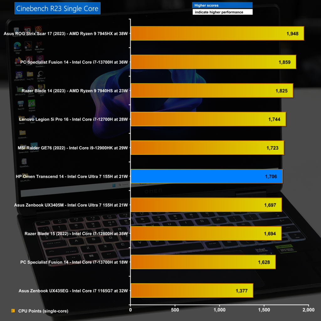 KitGuru recently reviewed an Asus Zenbook 14 OLED UX3405M (read it HERE) with the same Intel Core Ultra 7 155H CPU so that laptop has a fair amount in common with this HP Omen Transcend 14. The big difference is that the Asus is a thin and light model that uses integrated Intel graphics while this HP Omen has add-in Nvidia GeForce RTX 4060 Laptop graphics and a more substantial Omen Tempest Cooling GO to keep the CPU and GPU under control. This have an obvious impact on the graphics performance but also means that HP Omen is able to feed the CPU with 45W of power where Asus was limited to 30W.