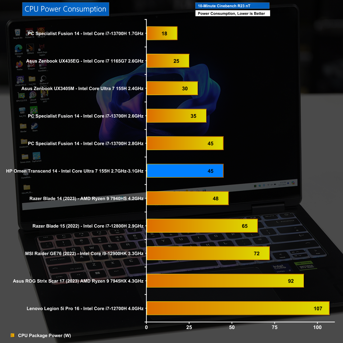 KitGuru recently reviewed an Asus Zenbook 14 OLED UX3405M (read it HERE) with the same Intel Core Ultra 7 155H CPU so that laptop has a fair amount in common with this HP Omen Transcend 14. The big difference is that the Asus is a thin and light model that uses integrated Intel graphics while this HP Omen has add-in Nvidia GeForce RTX 4060 Laptop graphics and a more substantial Omen Tempest Cooling GO to keep the CPU and GPU under control. This have an obvious impact on the graphics performance but also means that HP Omen is able to feed the CPU with 45W of power where Asus was limited to 30W.