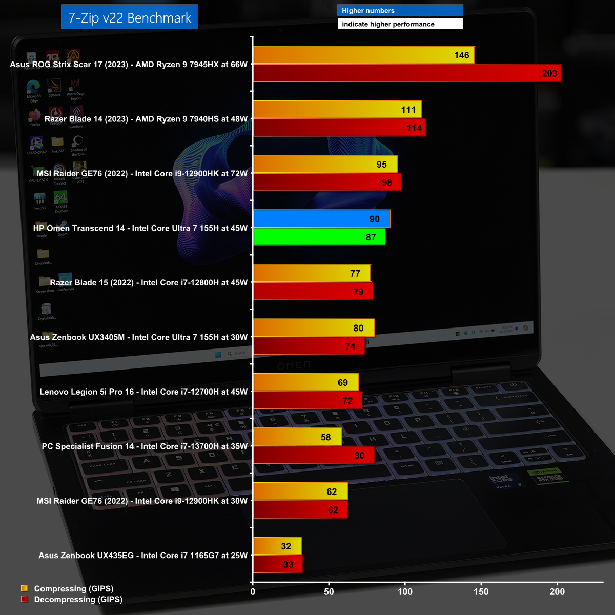 In the 7-Zip v22 benchmark test we see the HP Omen performs well and the Core Ultra 7 is more akin to a Core i9 than a Core i7.
