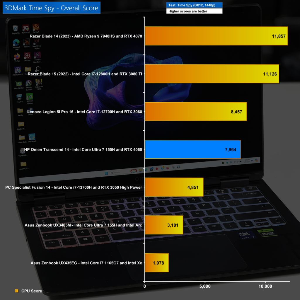 In 3D Mark Time Spy we see a decent Overall Score and when we compare to the Asus at the bottom of the chart it is clear the Nvidia RTX 4060 graphics are playing a major role.
