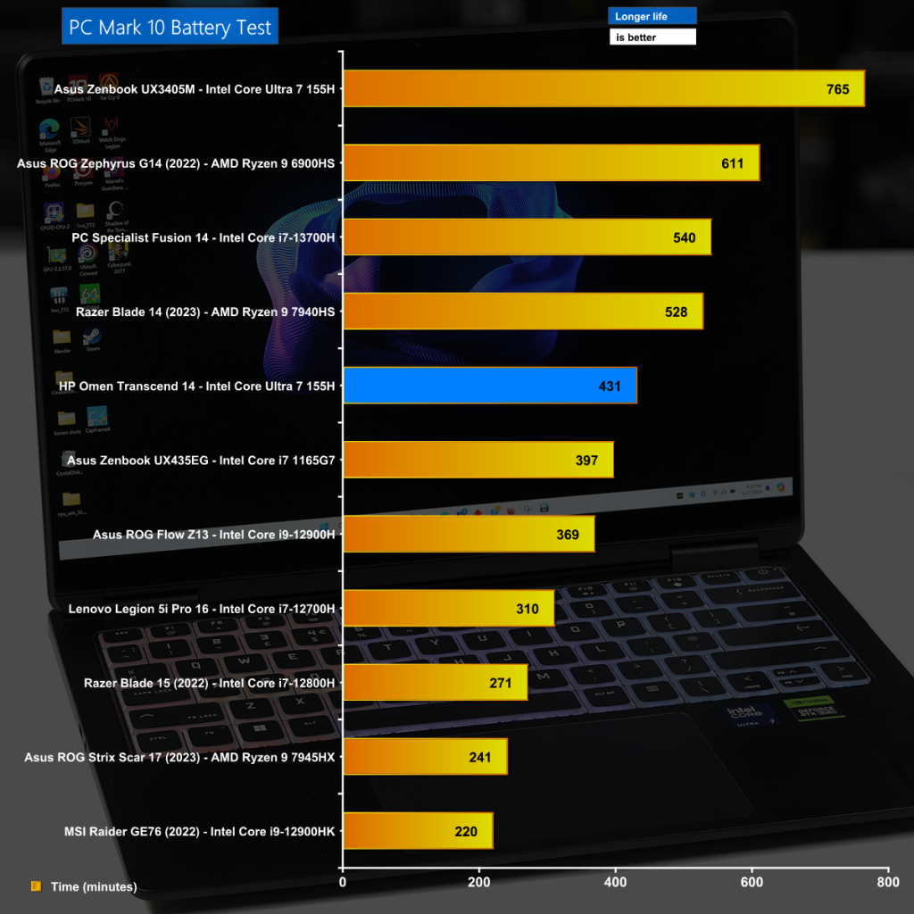 We were slightly disappointed by the result of the PC Mark 10 Battery Test which are middling at best. The battery is rated at 5,830mAh where Asus used a 9,420mAh unit in the Zenbook 14, and we have to assume the decision was driven by the limited space available inside the HP Omen chassis.