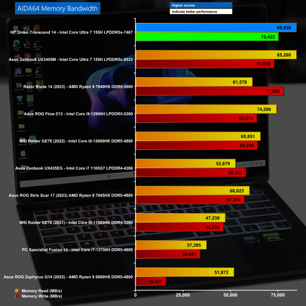 The AIDA64 Memory Bandwidth test threw up an odd result as the 32GB of LPDDR5X-7467 in dual channel performed better than we expected and beat the ‘faster' LPDDR5X-8533 used by Asus.
