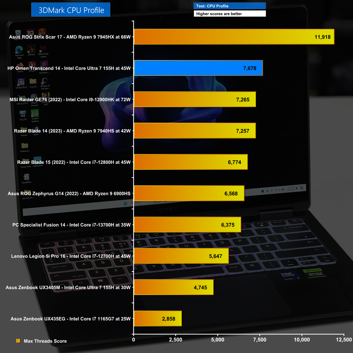 Moving on to 3D Mark CPU Profile we can see the benefit of the extra power used by the HP Omen operating at 45W compared to the Asus at 30W. Even so, the performance is higher than we might expect.
