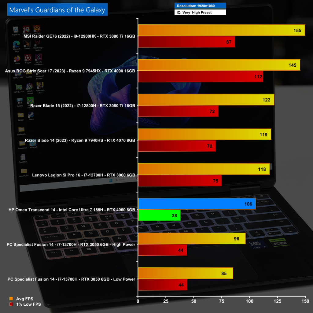 We start our games testing in Marvel's Guardians of the Galaxy at 1440p and the power of the RTX 4060 Laptop graphics deliver a healthy frame rate however the 1% low figure is slightly disappointing.