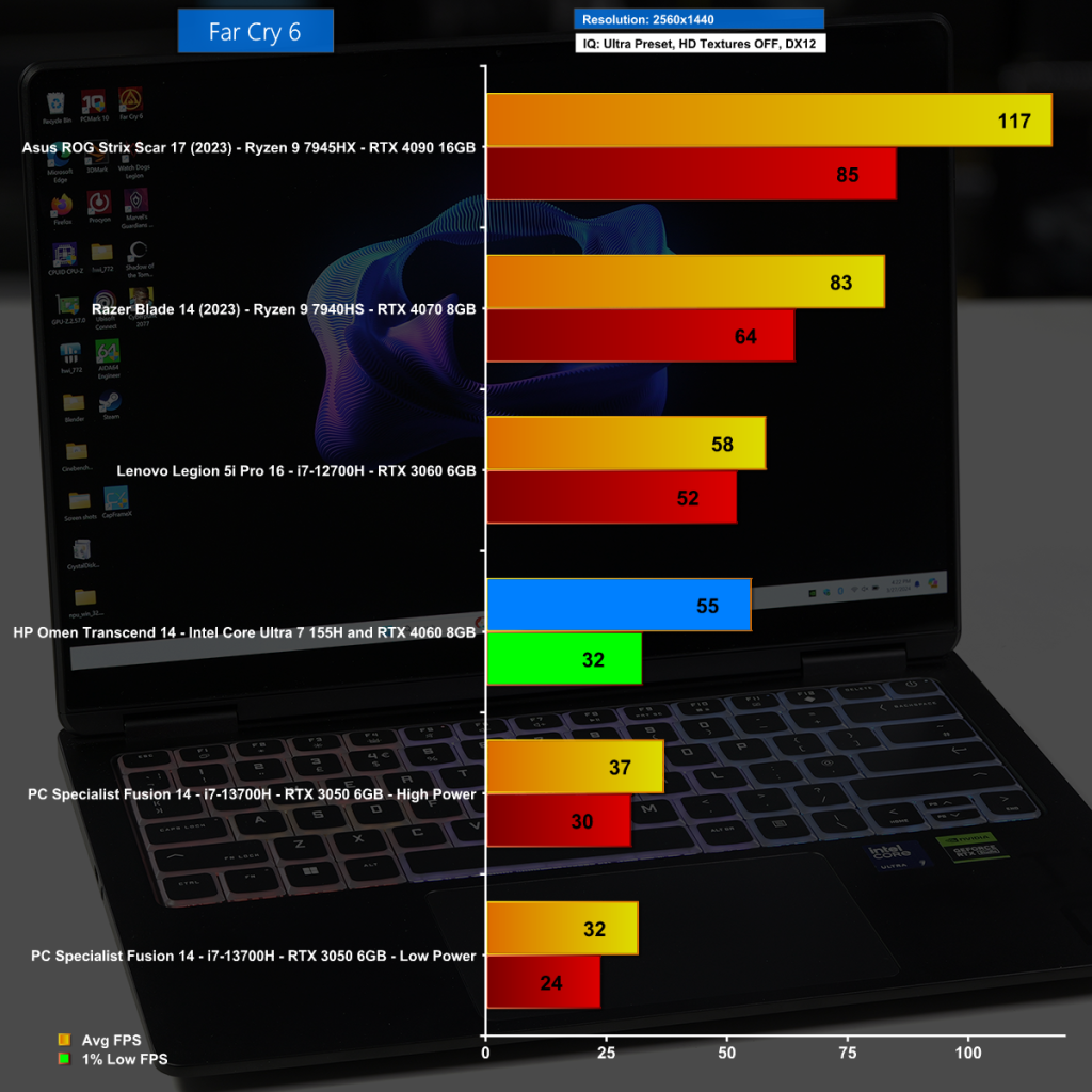 Far Cry 6 at 1440p is clearly pushing the HP Omen hard with image quality set to Ultra. The average frame rate is slightly on the low side and the 1% low is disappointing,