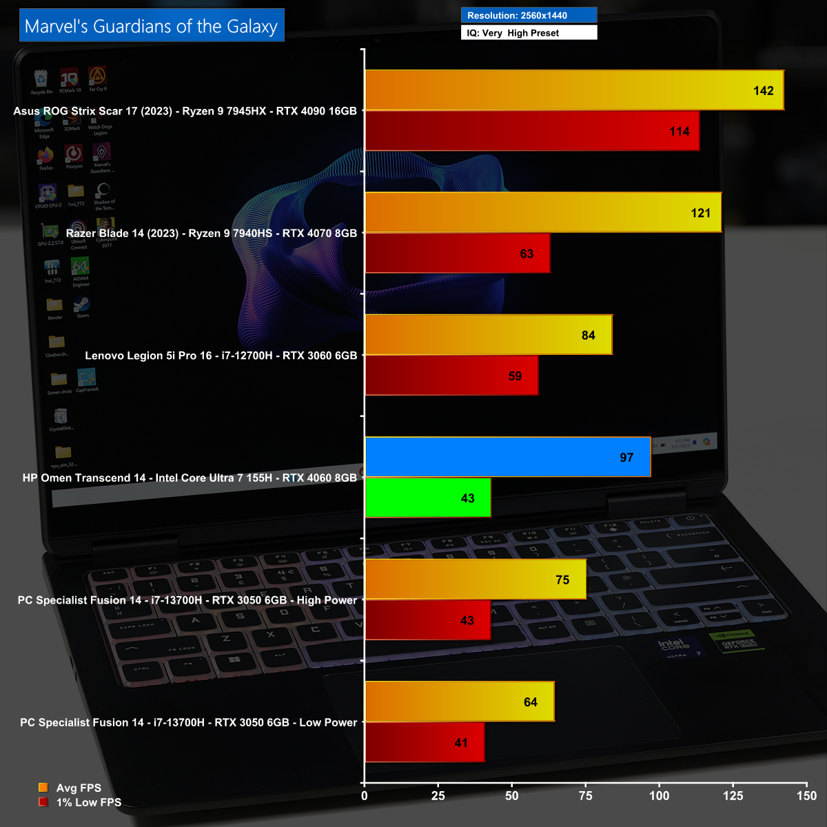 We start our games testing in Marvel's Guardians of the Galaxy at 1440p and the power of the RTX 4060 Laptop graphics deliver a healthy frame rate however the 1% low figure is slightly disappointing.