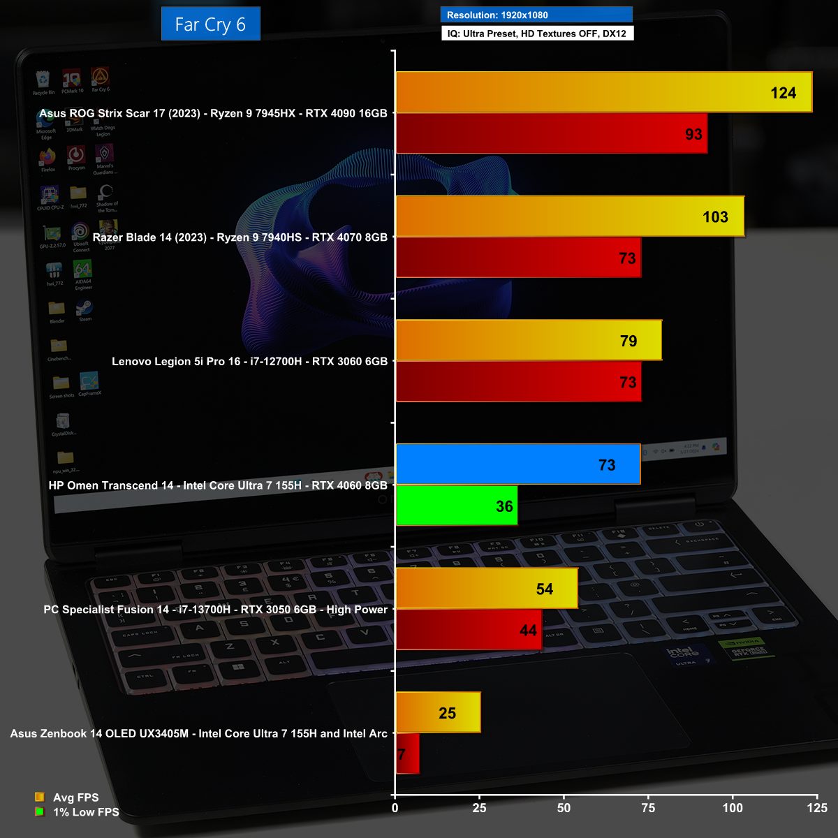 In Far Cry 6 at 1080p we see HP Omen running smoothly but once again the 1% low is unimpressive.
