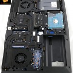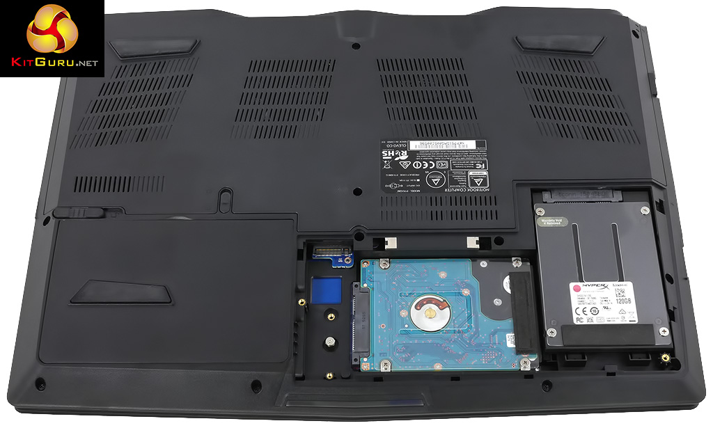 Flip the laptop over and you have easy access to the battery, and under the smaller of two covers you will find three of the drive bays. The larger cover conceals the second M.2 bay as well as the memory, CPU and graphics. The only piece of hardware we failed to reveal during photography is the Wi-Fi chip which is a Killer Wireless-AC 1535. This card is located under the keyboard and appears to be installed at an early stage of assembly, unless there is some clever trick to releasing the keyboard that we missed.