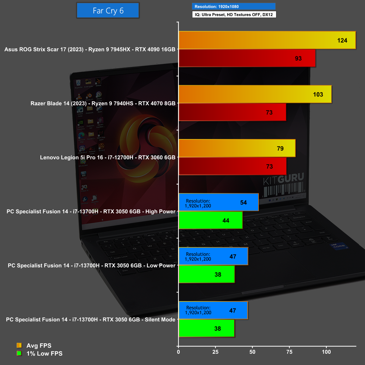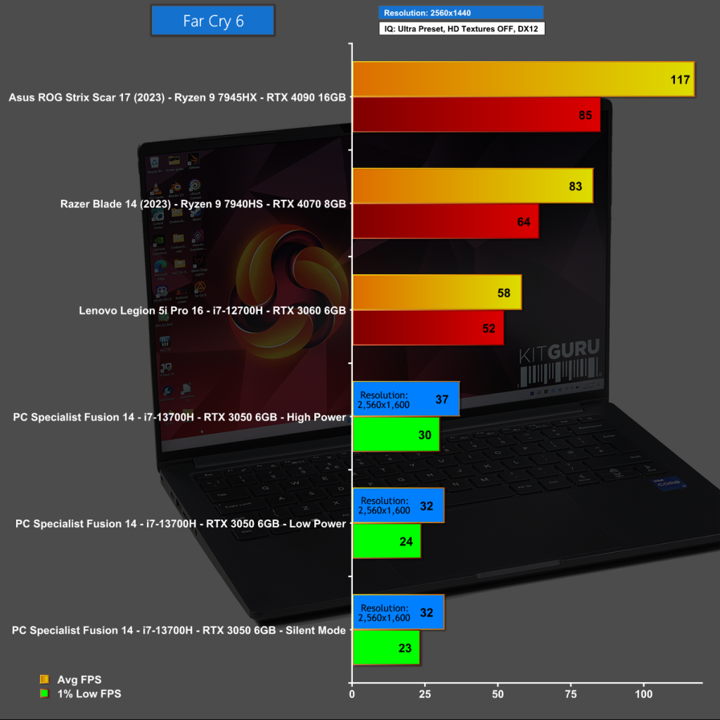 Far Cry 6 at 1440p is a struggle on the PCSpecialist 14-inch Fusion, not least because the 2,880 x 1,800 screen means we are actually playing at 2,560×1,600. The performance here is clearly unacceptable.