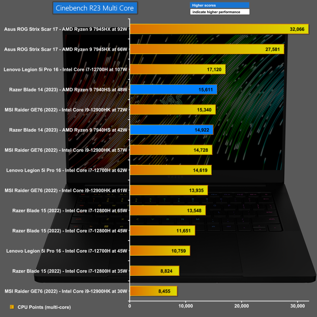 Blender 3.1 Classroom shows the Razer Blade is able to match the performance of Intel platforms that require twice as much power.