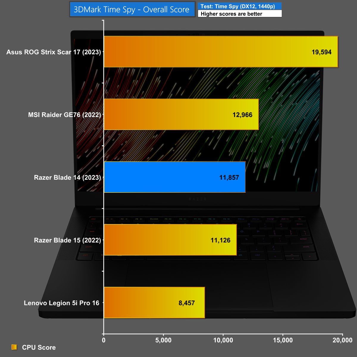 The CPU Score element of 3DMark Time Spy shows the Razer Blade 14 in a relatively poor light, close to the bottom of the chart.