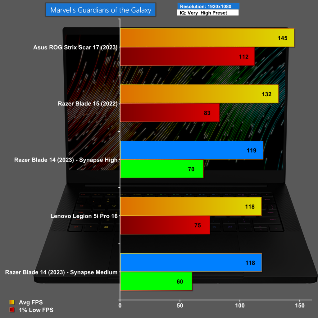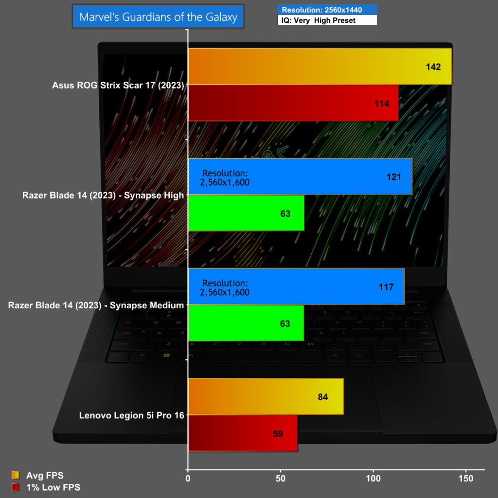 Marvel's Guardians of the Galaxy at 1,920×1,080 shows the Razer 14 performing at the same level as the Lenovo Legion 5i Pro 16, once we have Razer Synapse set to High.