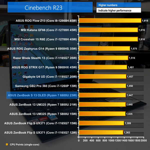 Multi-threaded performance from the Ryzen 7 6800U is very strong. Cinebench R23 is 12% quicker than the Ryzen 7 5800U inside an almost identical laptop. And as we see from the Blender BMW numbers, AMD’s new low-power 6800U isn’t far behind a chassis-restricted Core i9-12900H.