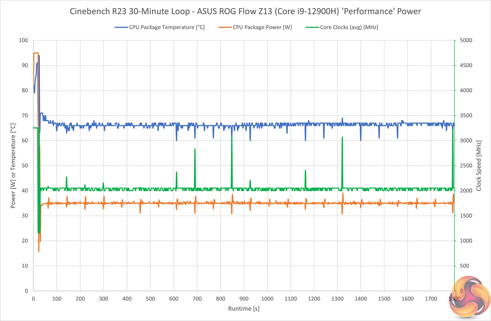 Looking at the chart for temps, power, and clocks gives us a good overview of how the Core i9-12900H CPU operates in the ROG Flow Z13 under the default Performance power mode.