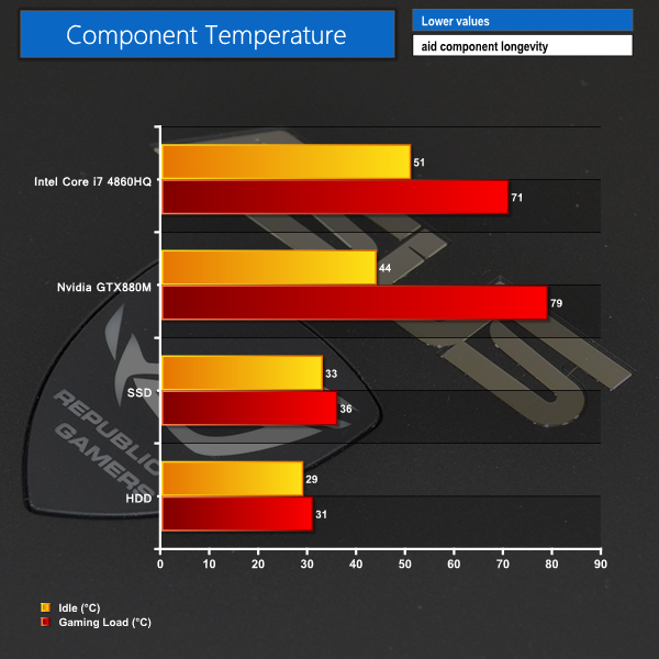 Pumping a gaming load through the system sees CPU and GPU temperatures increase past 70°C. The GTX 880M hits 80°C at certain points.