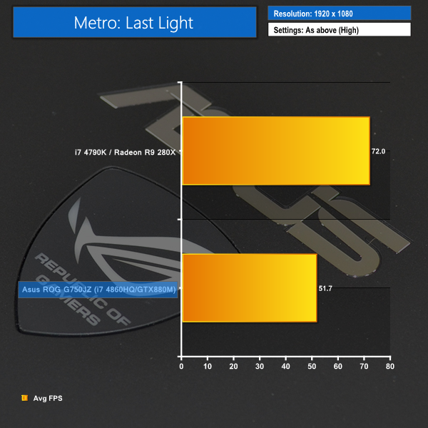 Gaming performance of the 8GB GTX 880M GPU is strong at the G750JZ's 1920×1080 display resolution. Bioshock Infinite frame rates are perfectly playable at our settings, and Metro: Last Light is largely smooth, with occasional drops.