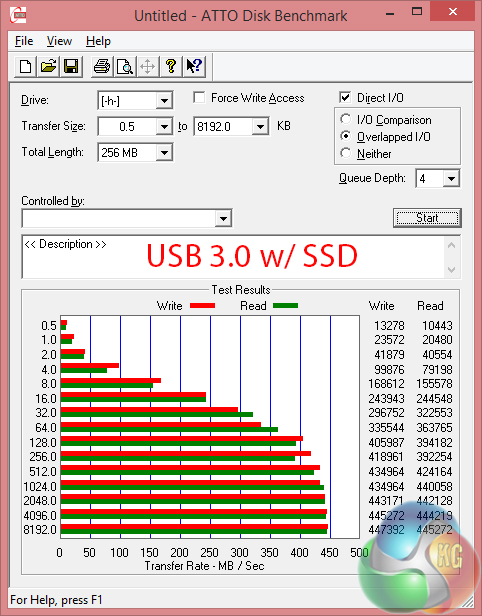 We tested USB 3.0 performance using the Kingston HyperX 3K SSD connected to a SATA 6Gb/s to USB 3.0 adapter powered by an ASMedia ASM1053 controller.