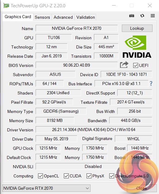 The RTX 2070 laptop edition GPU used in ASUS’ machine features a 1215MHz base clock and 1440MHz Boost frequency. 8GB of GDDR6 memory is clocked at 1750MHz (14000MHz effective) and sits on a 256-bit bus. Nvidia’s TU106 GPU is built on TSMC 12nm process technology and features a TDP of 115W.