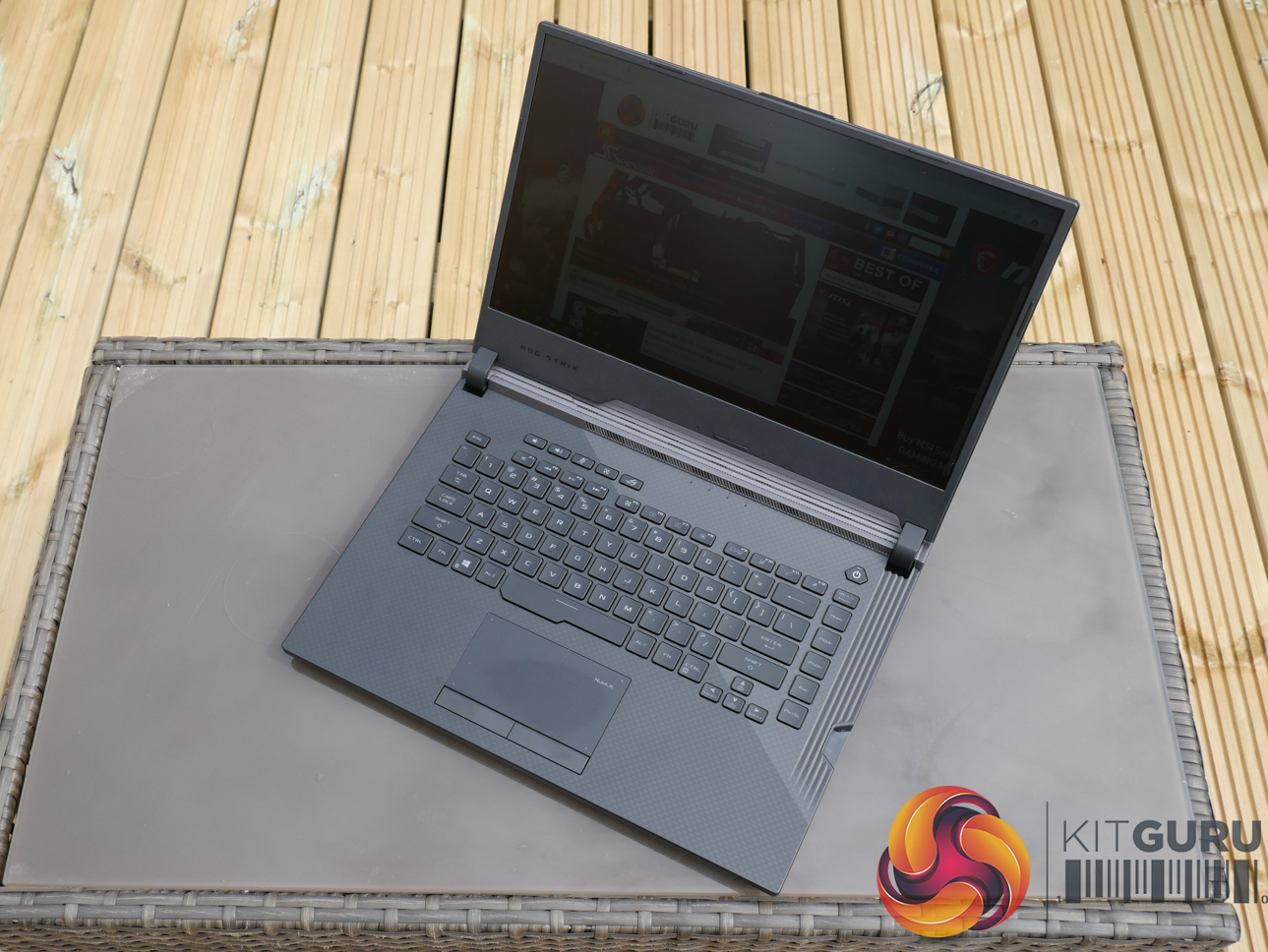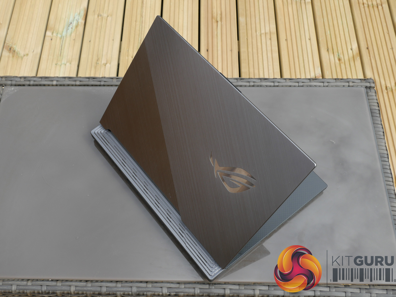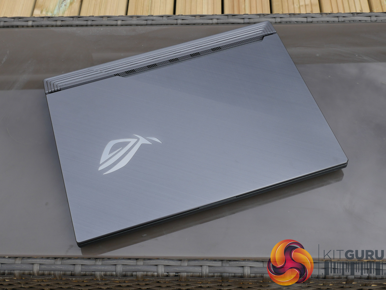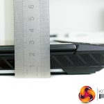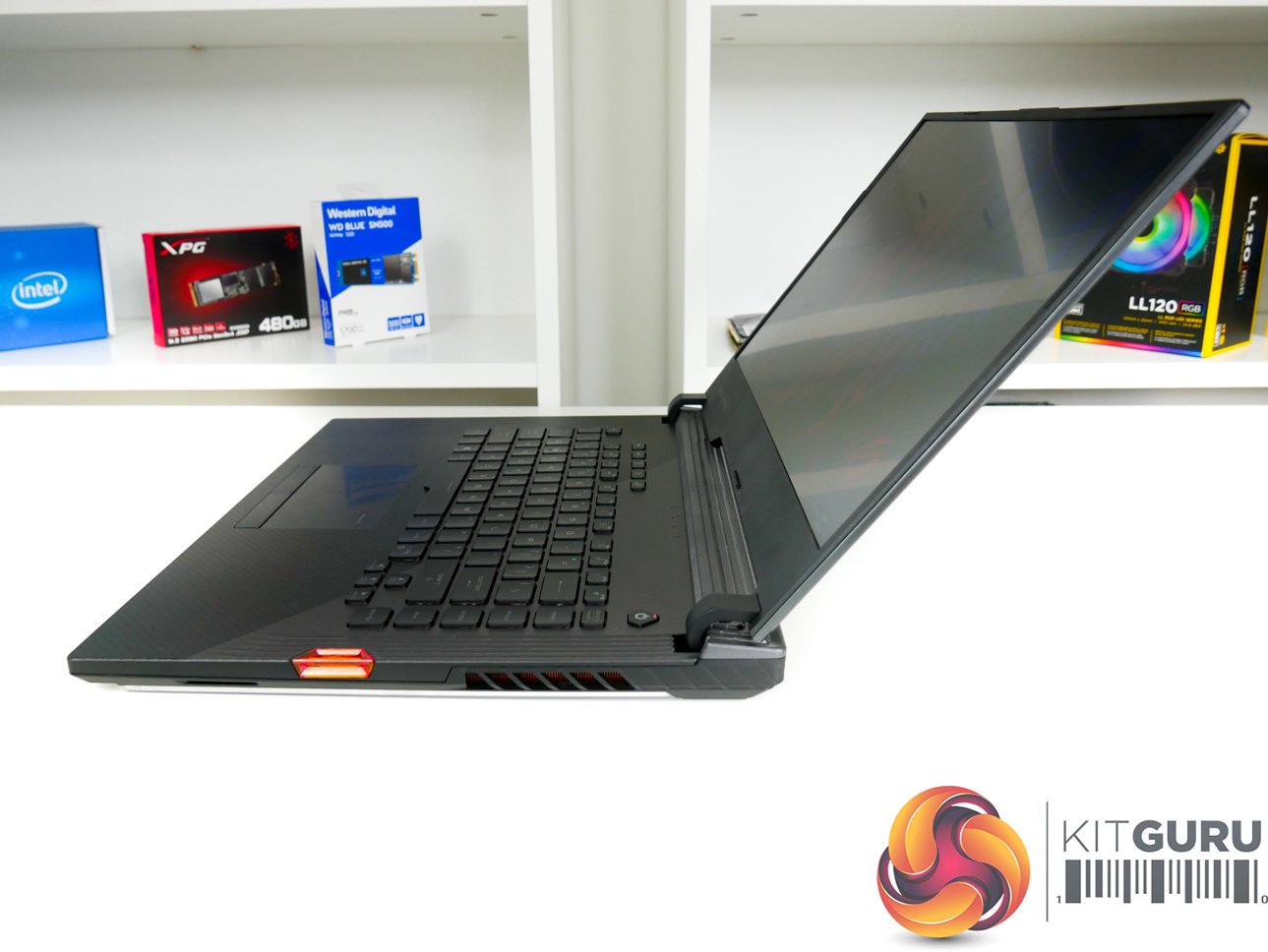 The G531GW measures in at 36cm wide, 27.5cm deep, and 2.6cm thick. Weight is just under 2.4kg, according to ASUS' specifications. Vents at the rear of the chassis extend past the screen hinge, thus limiting the maximum rotation angle slightly.