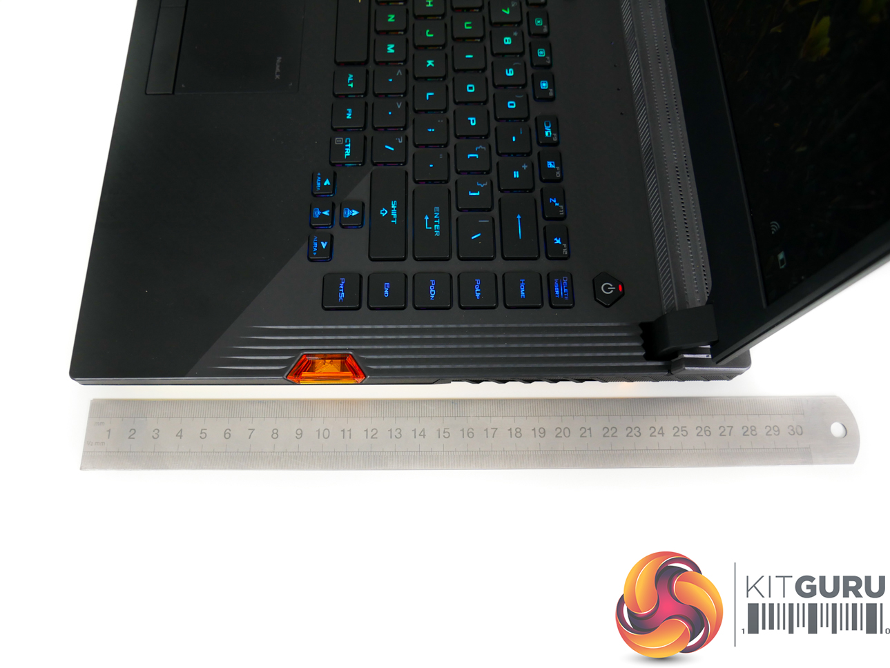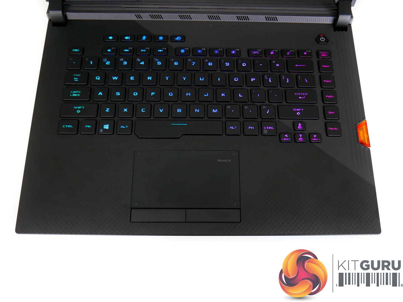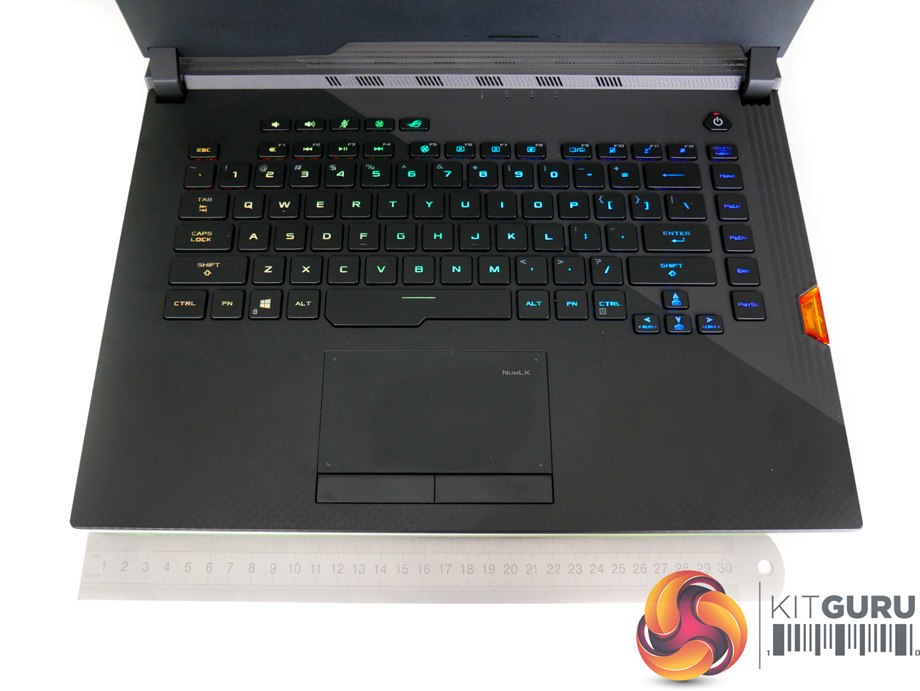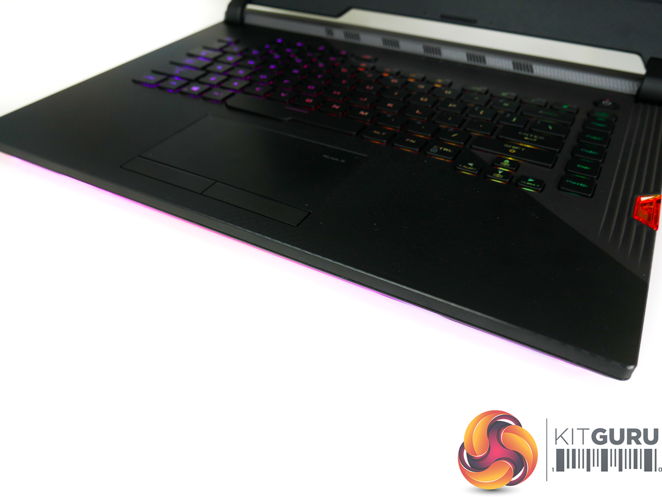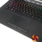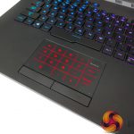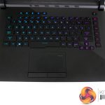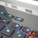 Per-key RGB lighting on the chiclet keys is strong, bright, and can be controlled easily. N-Key rollover is supported, and ASUS provides a good number of dedicated hotkeys. The NFC-enabled Keystone chip is inserted on the right-side of the laptop and fits well with the overall styling, adding a small touch of orange contrast.