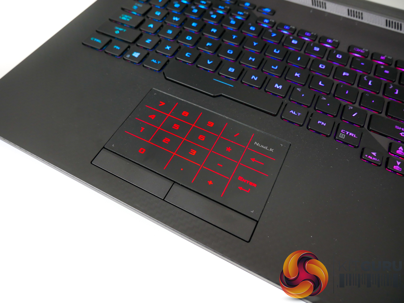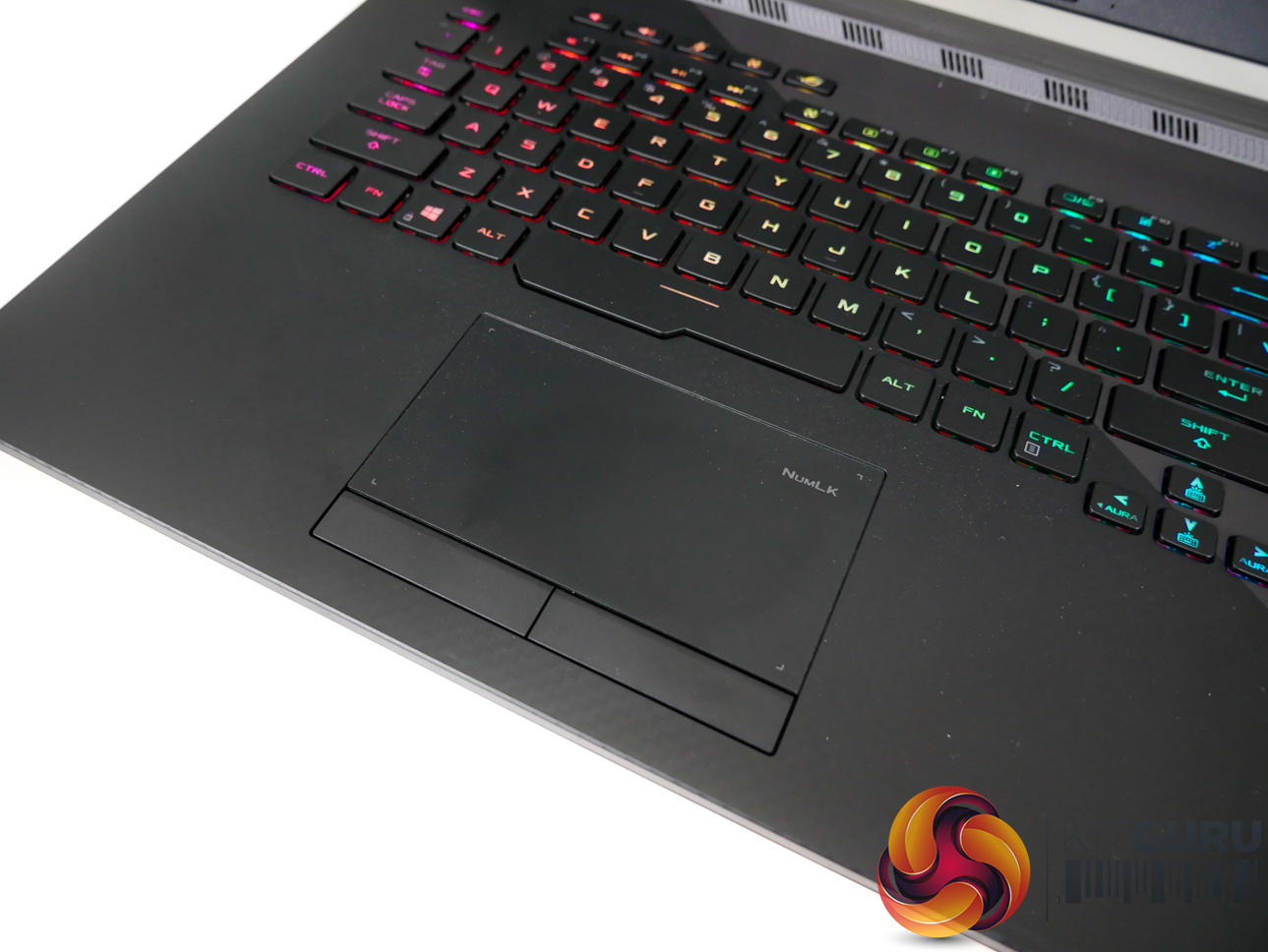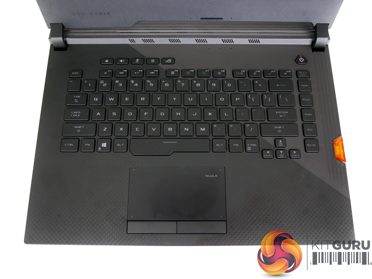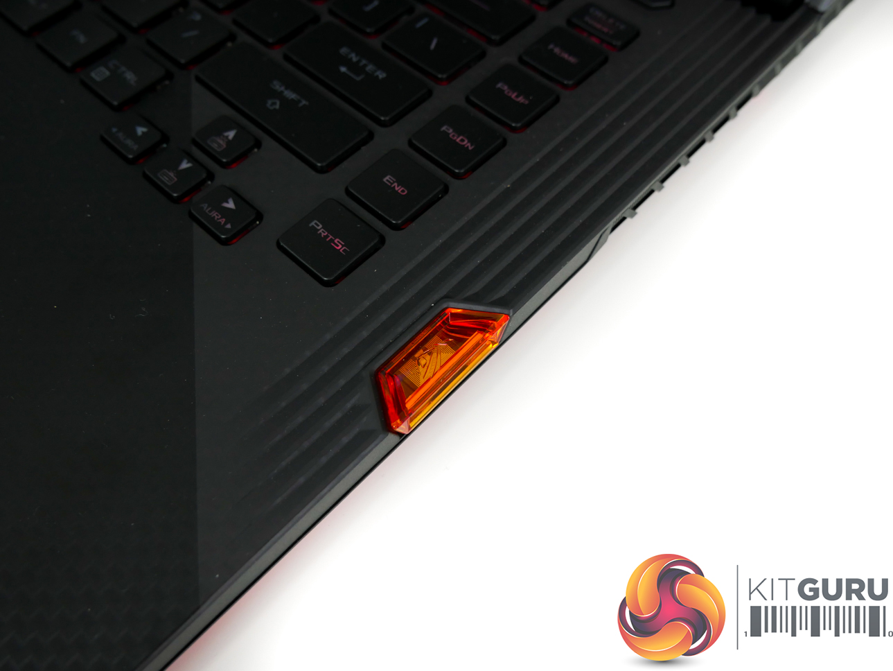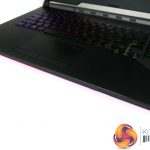 Per-key RGB lighting on the chiclet keys is strong, bright, and can be controlled easily. N-Key rollover is supported, and ASUS provides a good number of dedicated hotkeys. The NFC-enabled Keystone chip is inserted on the right-side of the laptop and fits well with the overall styling, adding a small touch of orange contrast.