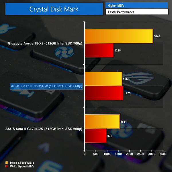 One area where ASUS deserves criticism is in the Scar III G531GW’s choice of SSD. While the 1TB Intel SSD 660p drive in our test sample was perfectly snappy and didn’t cause many hiccups during general use, it is undeniably budget for a £2.8k, ultra-high-end gaming laptop.