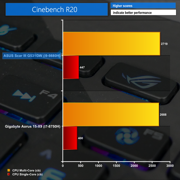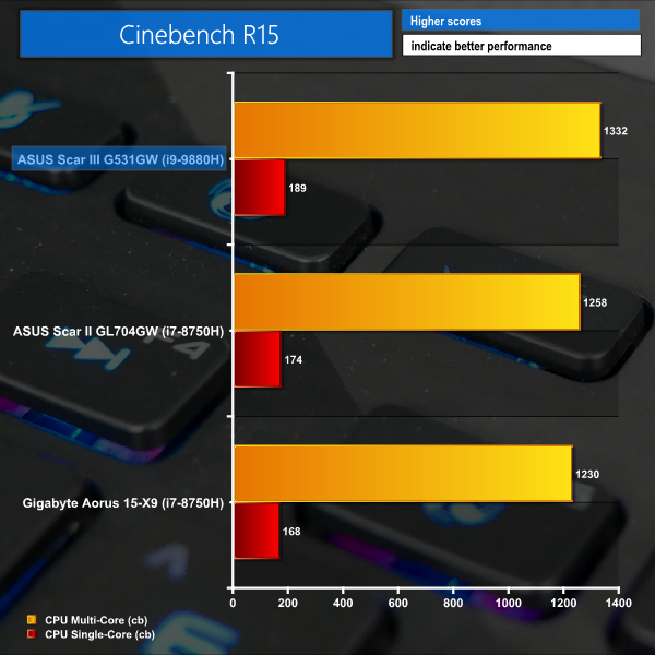As is clear, the aggressive boost clocks achievable with the combination of Intel’s new 14nm++ Core i9-9880H CPU and ASUS’ solid cooling mechanism result in superb Cinebench single-threaded performance. ASUS’ G531GW is noticeably quicker than competitors using the older, yet very popular, Core i7-8750H in the single-threaded domain.