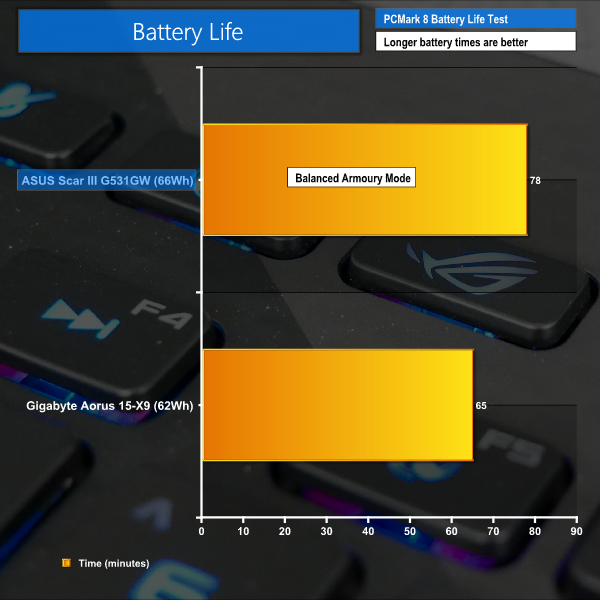 While the battery life clearly isn’t ideal for users who want mobile performance, that is not really the intention of ASUS’ Scar III. This gaming machine is almost certainly going to be pushing through gaming titles with the 280W power brick firmly connected.