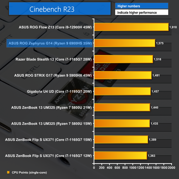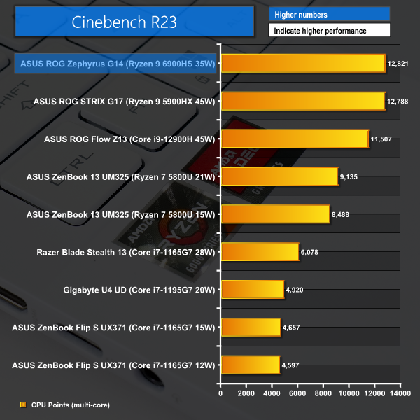 Blender’s short BMW test also sees the G14 and its Ryzen 9 joint-topping our chart. Here, the new Zen 3+ HS-series chip beats out the Core i9-12900H inside a comparable chassis.