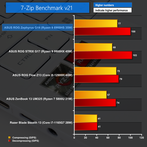 7-Zip in its multi-threaded performance benchmark is another strong showing for the 6900HS. As always for the Zen-based architectures, decompressing performance is particularly strong. High-speed DDR5 memory is likely helping the Zephyrus G14 here too.