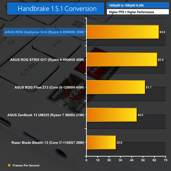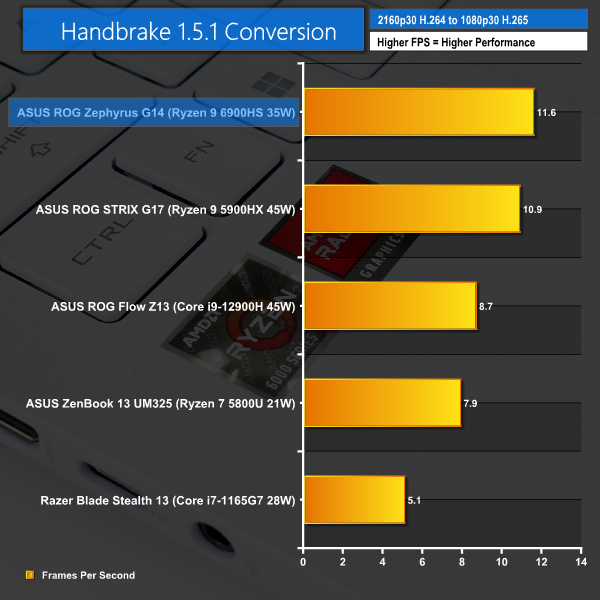 Handbrake sees another strong victory for the 45W-operating Ryzen 9 6900HS inside the ASUS G14. Frequency boosts and cache improvements for the new chip help it offer a small performance boost over the 45W Ryzen 9 5900HX. And versus the Core i9-12900H that is running at 35W long-duration power, the 6900HS is considerably quicker.