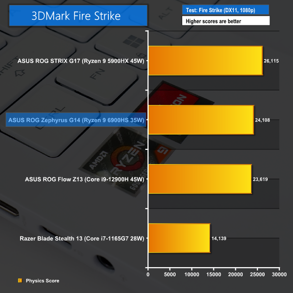 3DMark Time Spy shows strong performance for the G14, albeit with minimal margins between the three gaming big boys in this test. Fire Strike is a little more preferential towards the higher-powered Ryzen 9 5900HX system thanks in large to its bigger chassis with greater power capability.