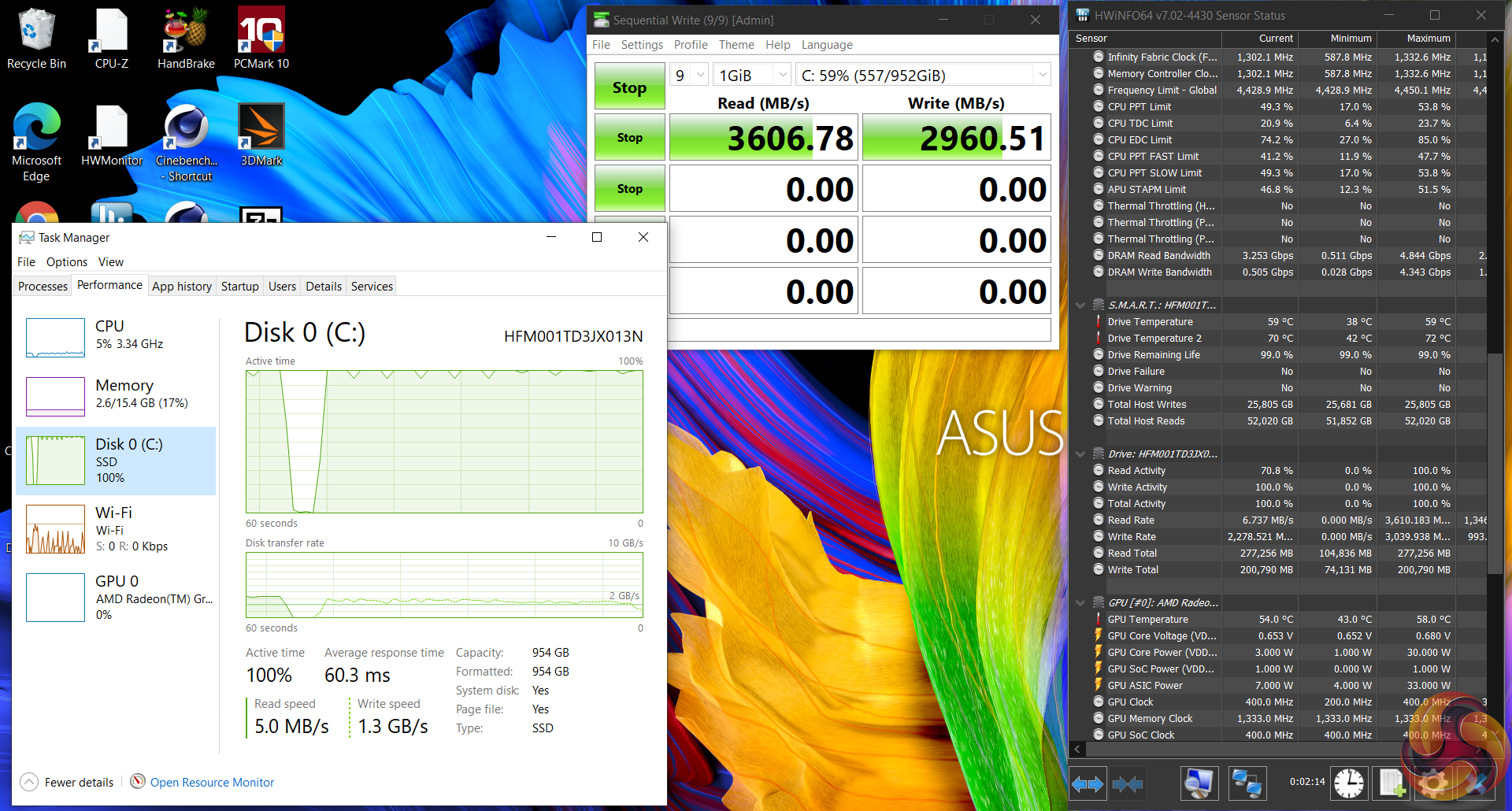 ASUS deploys a better WD SN730 SSD on the Intel system. The AMD laptop’s SK Hynix 1TB drive does, however, hit 3GBps writes. Thankfully, neither drive had cooling issues even with heavy sustained loads.