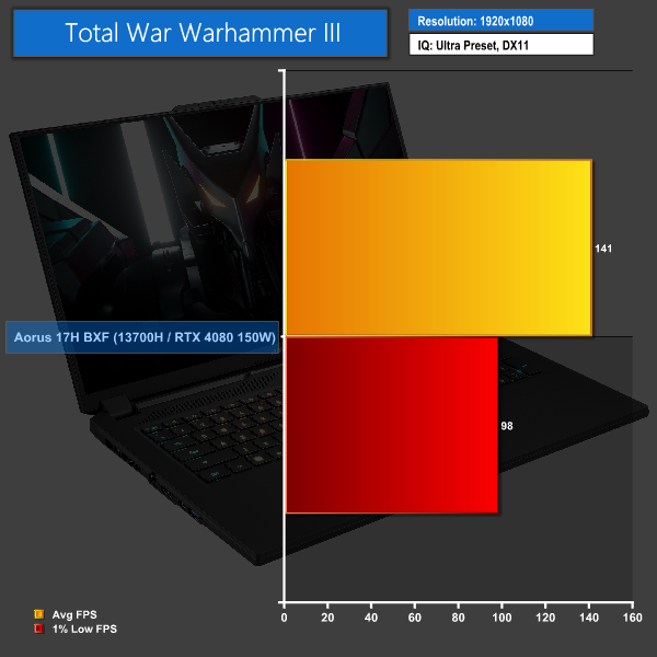 Total War Warhammer III continues the trend of very healthy average FPS levels and a 1% low score near to 100 FPS. In fact, this is once again similar performance to a desktop Radeon RX 6800 XT. That’s an impressive result for a gaming laptop.