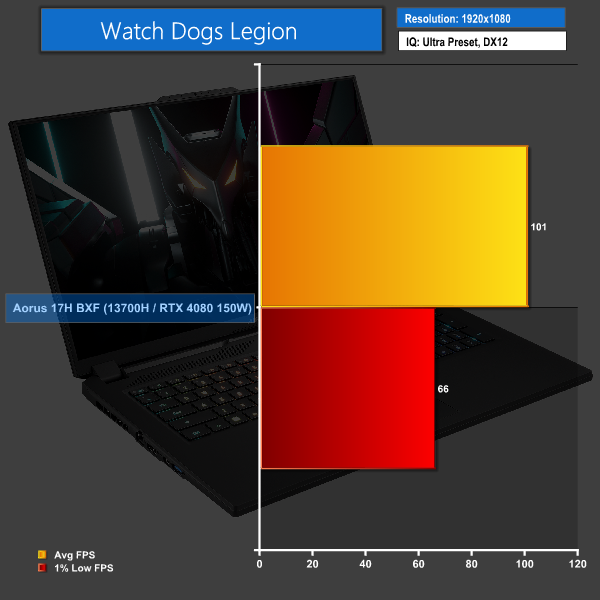 Finally, we see Watch Dogs Legion running at 101 FPS average, with a 1% low of 66 FPS. That’s more than enjoyable on this Full-HD screen.