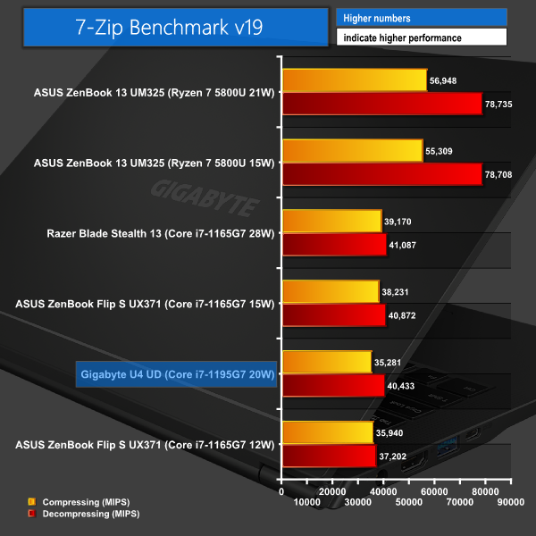 7-Zip places considerable emphasis on memory performance – particularly bandwidth. This is why Gigabyte’s 1195G7-equipped U4 UD slips to just above bottom place, despite its strong processor.