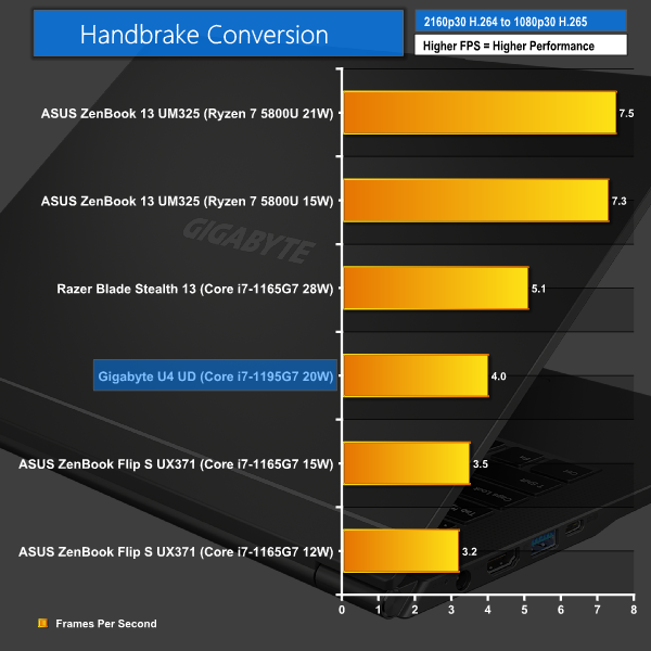 Handbrake video conversions on these lower power processors effectively acts as a long-duration multi-threaded test once again. In the lengthy Handbrake runs, it is unsurprising that the Gigabyte U4 UD and its 20W sustained Core i7-1195G7 sits above the 15W 1165G7 in the ASUS ZenBook and below the 28W version of the 1165G7 in the Razer Blade Stealth 13.