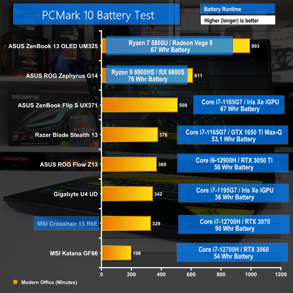 Battery life is actually pretty reasonable for this configuration of laptop. We managed around five-and-a-half hours even with the screen maintained at its 83-165Hz dynamic refresh rate. That’s really pretty good and is thanks largely to the 90Whr battery.