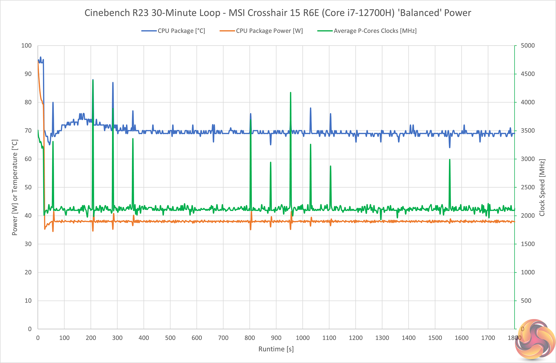 Just as we saw with the cheap Katana GF66 that we reviewed recently, MSI runs the Balanced power profile with the Core i7-12700H CPU getting around 38W sustained power under long-duration Cinebench loading.