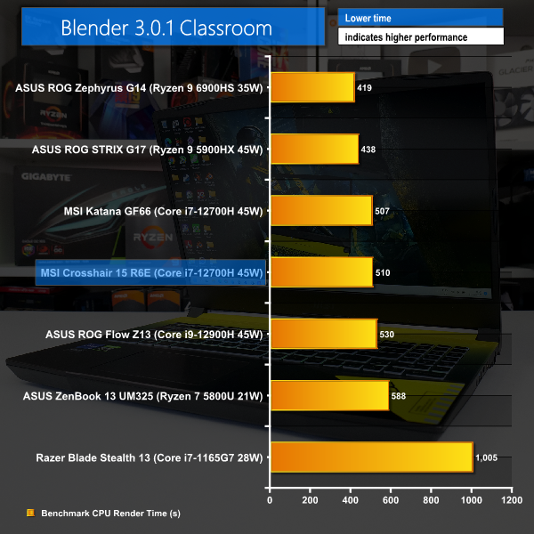 MSI does well to hang with the Ryzen competitors in the short Cinebench test run. But the longer duration Blender tests really play into the hands of competing Ryzen laptops.