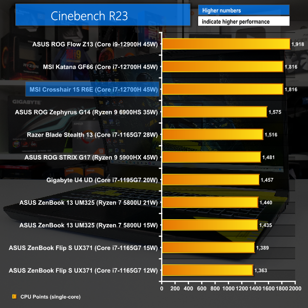 Single-threaded performance is where the Core i7-12700H and its lofty clocks inside the MSI Crosshair 15 R6E are strong, particularly against even Ryzen 6000 competition.